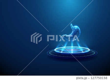 Stomach on futuristic podium. Digestive system, gastric diagnostics, biotech treatment, artificial organ technology concept.