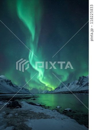 Colorful Northern Lights Aurora Borealis in dramatic night sky over snowy mountain range and frozen mount lake at polar nighttime. With no people peaceful arctic winter landscape 3D illustration.