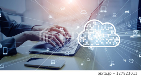 オフィスでノートパソコンを使うビジネスパーソンとクラウドコンピューティングのコンセプト