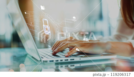 Cybersecurity and privacy protection network security computer and safe data concept. Businessmen protect personal data information from viruses with virtual screen interfaces.