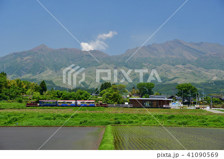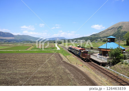 阿蘇山をバックに走る南阿蘇鉄道トロッコ列車