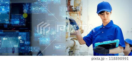 工場の機械や配管を点検するエンジニアとデジタルテクノロジー バナー・広告向け横長ビジュアル