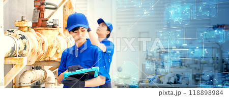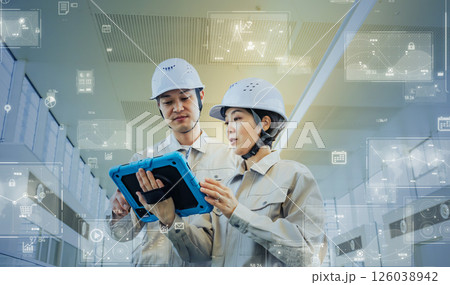 タブレットを見ながら点検する男女作業員とデジタルテクノロジーのコンセプト