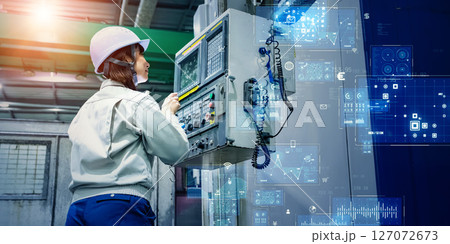 工場でコントロールパネルを操作する作業員とデジタルテクノロジーのコンセプト