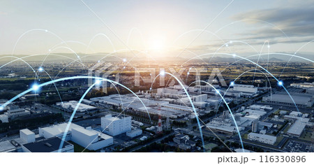 工業地帯の空撮とデジタルテクノロジーのコンセプト