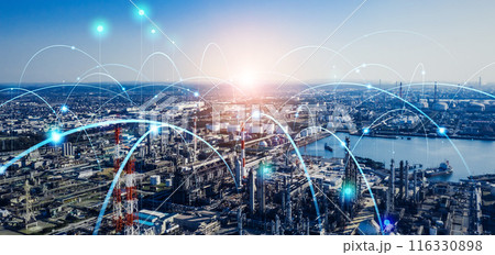 工業地帯空撮とデジタルテクノロジーのコンセプト