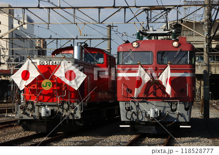 お召仕様で展示されるDD51形とEF81形の並び