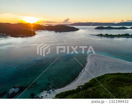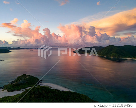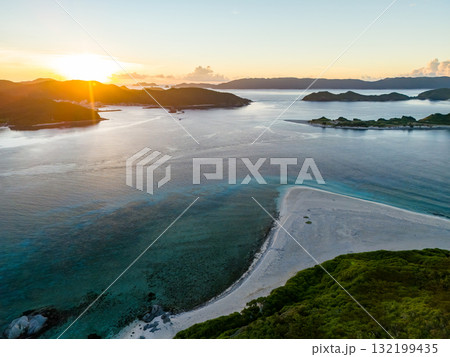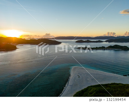 座間味港で慶良間諸島の日の出をドローンで空中撮影している。沖縄県島尻郡慶良間諸島座間味島座間味港