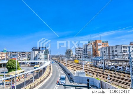 日本の横浜都市景観 長津田駅や電車、長津田駅前などを望む