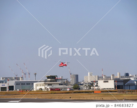 大阪 八尾空港 管制塔と着陸するヘリコプター( AS365/565 Dauphi、八尾、初冬)