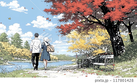 水辺の紅葉の小径でデートしている若いカップル