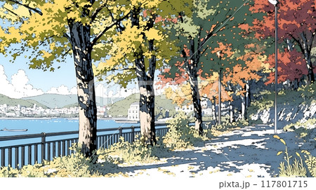 水辺の紅葉の小径を散策している若い女性