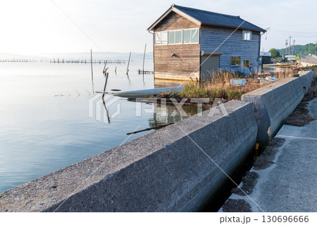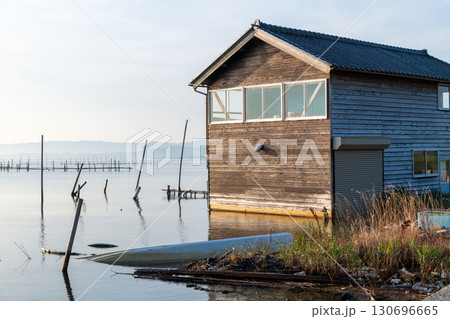 浸水したままの倉庫のある風景