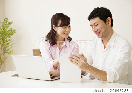 夫婦 カップル パソコン 女性 タブレット 家族 男性 主婦 笑顔 人物 ミドル ライフスタイル