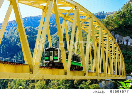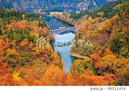只見線 紅葉が美しい朝の第一只見川橋梁を渡る列車(福島県三島町、11月)
