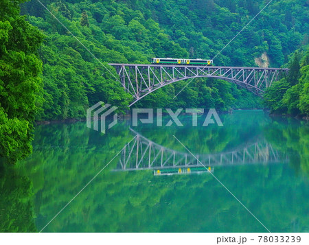 只見線「只見川第五橋梁を走る列車と川面の水鏡」