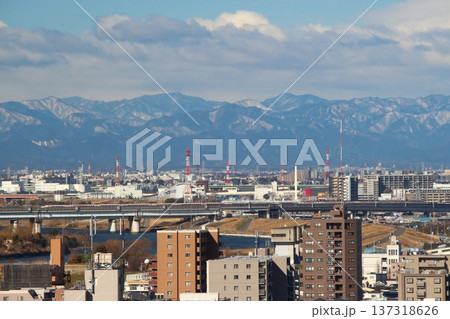 新潟平野を行く上越新幹線E4系と信越本線115系快速電車