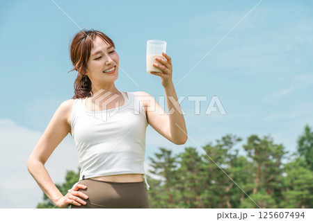 運動時にプロテイン・ドリンク・BCAA・EAAを飲む女性(ダイエット・栄養補給・ボディメイク)
