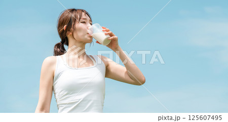 運動時にプロテイン・EAA・ドリンクを飲む女性(青空)