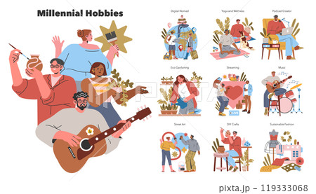 Millennial Hobbies set. Creative and modern leisure activities depicted through digital nomad lifestyle, yoga, podcasting, music, and more. Contemporary pastimes and self-expression. Vector