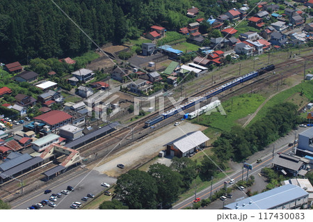 聳える妙義山に見守られて停車中のEF64‐1001号機牽引のELぐんまよこかわ2024/8/17撮影
