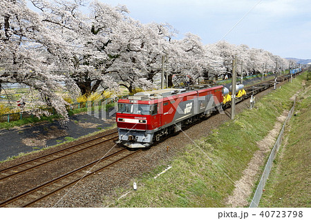 白石川堤一目千本桜を行く東北本線福山レールエクスプレス号(貨物列車)