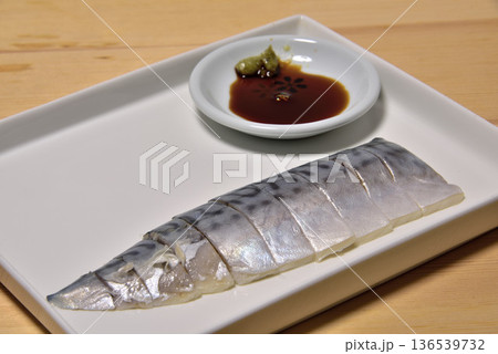 皿に盛った新鮮な鯖の刺身とごまだれ