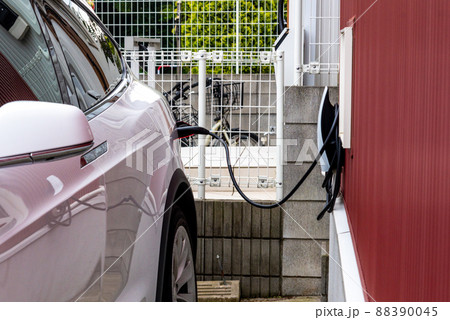 自宅の充電スタンドに充電している電気自動車のイメージ