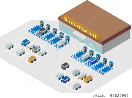 アイソメトリックなEV充電スポットがあるスーパーマーケットのイラスト