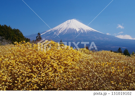 快晴の青空と冠雪した富士山を背景に早春に咲くミツマタの黄色い花