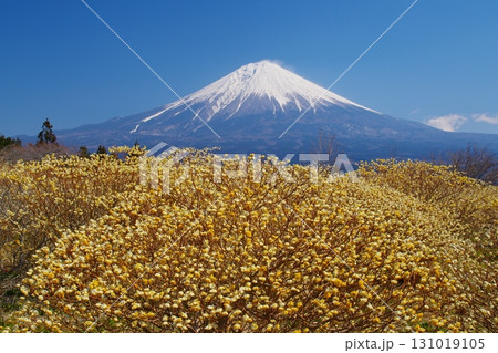 早春に咲く黄色いミツマタの花を前景に白雪残る富士山西麓の景色 Ver4