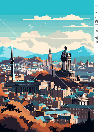 Travel Destination in Edinburgh Scotland vintage print. holidays concept of illustration