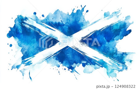 Grunge painted Scotland flag. Template for invitation, poster, flyer, banner, etc. Abstract watercolor splashes flag of Scotland. Saint Andrew day concept.