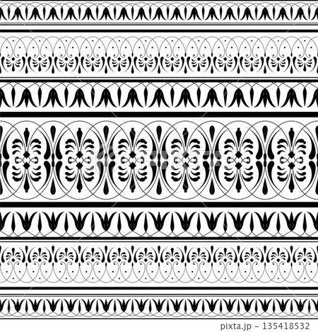Monochrome floral european seamless pattern arabesque. Design evokes sense of traditional art, reminiscent of fine china Delftware, earthenware, ceramic. Typical egyptian, assyrian, greek motive
