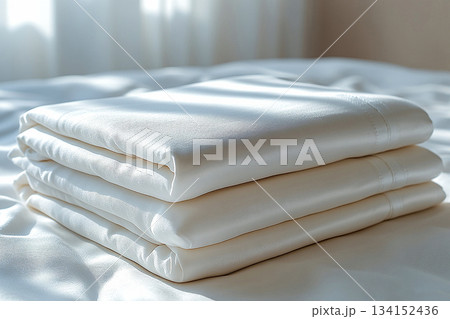 Attract interior designers. Lifestyle of premium clients. Egyptian cotton sheets on a white background. Stack of high-thread-count white sheets.