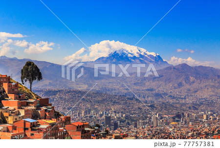 View to the snow cap of Illimani peak and valley full of living houses, El Alto, La Paz city, Bolivia