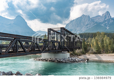 カナディアンロッキーの壮麗な景色:ターコイズブルーの川にかかるキャンモア・エンジン橋
