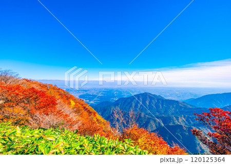 吊り橋(風のかけ橋)越しに眺める秋晴れの青空に映える紅葉〈大井平公園/愛知県豊田市稲武町〉