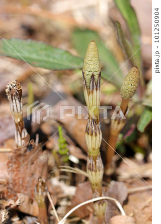 春の野にかわいい頭飾り(ハカマ)をかぶったツクシが地面から伸びている姿。