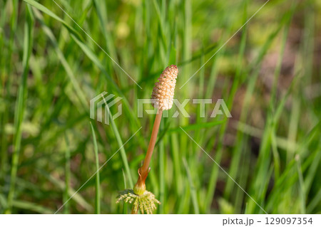 Closeup of an emerging herbaceous perennial plant, the field or common horsetail , Equisetum arvense, in the grass