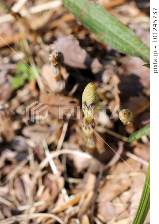 Closeup on an emerging Common horsetail plant, Equisetum arvense