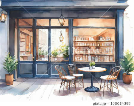 木の温もりが漂うヨーロッパ風カフェの外観|カフェ,テラス席,外観,木製家具,水彩風,植物