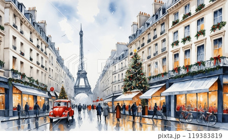 クリスマスのパリ│エッフェル塔│冬の街並み│水彩イラスト