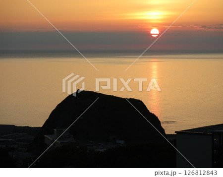 ウトロ温泉の高台にあるリゾートホテルから見たオホーツク海の夕日とオロンコ岩