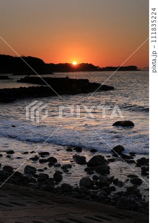 夏の鳥取県 白兎海岸から淤岐ノ島に沈む夕日を望む