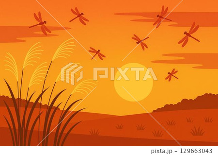 フレーム素材 秋イメージ 夕焼け空 ススキ 赤とんぼ アニメ調