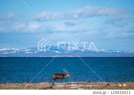 冬の野付半島・凍てつく湖畔を歩くエゾシカ