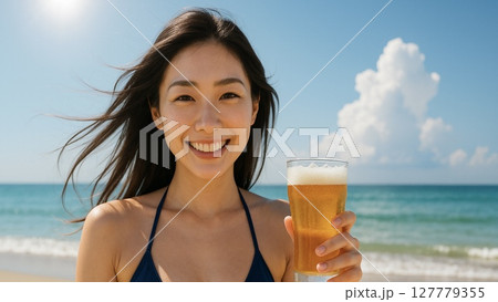 ビーチでビールを片手にくつろぐ、水着を着た笑顔の若い日本人女性(16:9横長バナー)