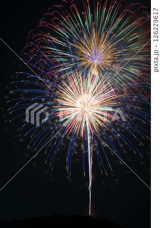 夏の夜空に映える夏の風物詩 打ち上げ花火風景 (鮎祭り花火大会 甲佐町)