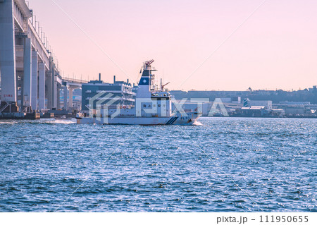 日本の横浜都市景観 海上災害やコンビナート火災に対応する海上保安庁の消防船「ひりゆう」などを望む